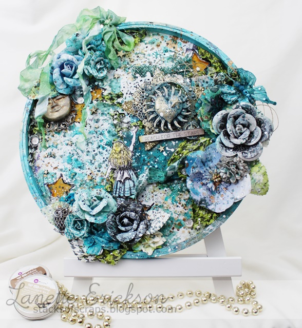 Products Used: Embroidery Hoop. 7 Dot Studio- Dreamer Collection Pattern Paper & Word Stickers.  Prima - Flowers, White Heavy Gesso, Bloom Sprays, Clear Gesso,  Butterfly, Paper Cay. Finnabair -Metal Trinkets, Wax, Metallic Acrylic Paint, Resist Canvas, Micro beads, Glitter. Creative Embellishments -Chipboard. Art Anthology Sorbet & Star Stencil. Viva Las Vegas stamp. Umwow -Star Confetti Chipboard. Misc- Burlap, Twine, Ribbon, Rhinestones,  White Acrylic & Black paint.