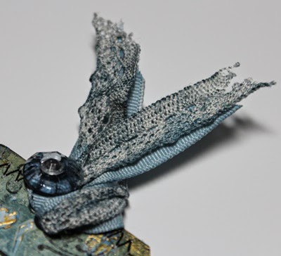 Here you can see a peek pf the doily that I misted and ruffled to form her dress.