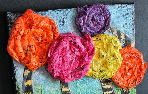 As you can see I started by ripping the bags into long strips. I then glued them to the center of a paper circle. From there I just rolled, twisted and glued. They ended up looking like this: