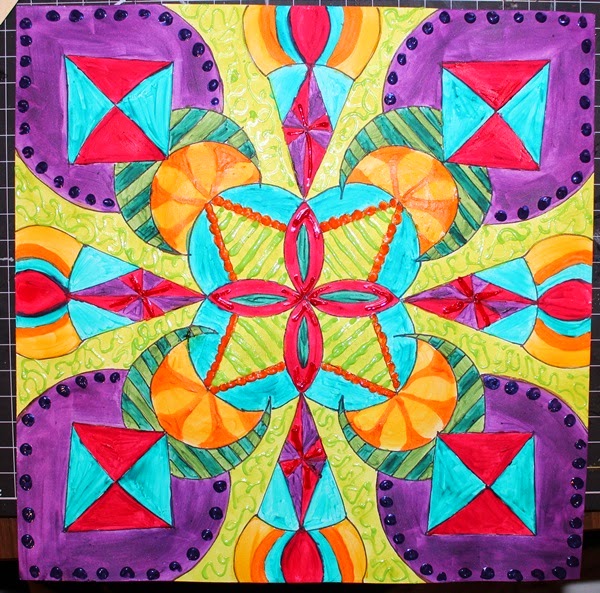 I went back and added some black to define my lines and cover up a few boo boos :) and with my white uni ball in had I added a few doodles and my first Mandala was done!